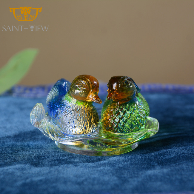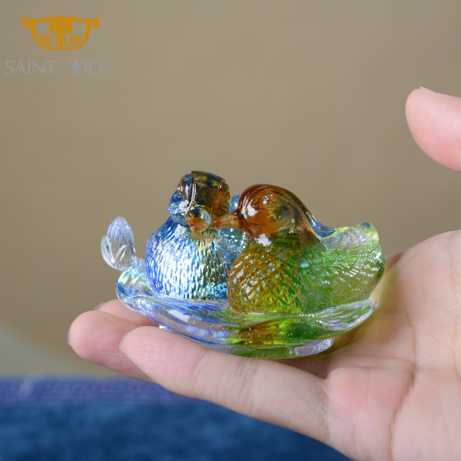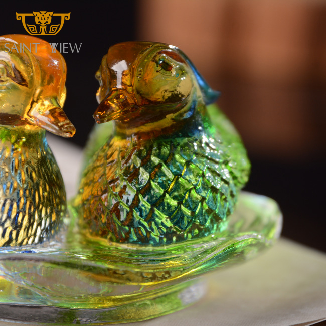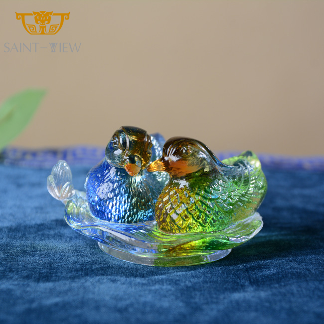 Two Mandarin Ducks Swimming Love Birds on Green Aventurine Lotus Figurines for Love and Romance