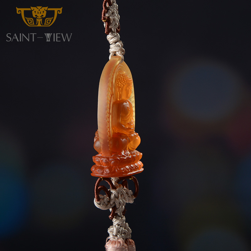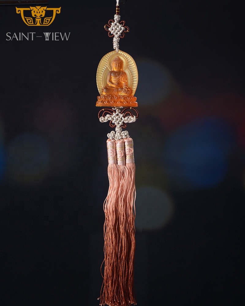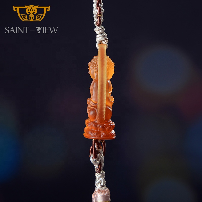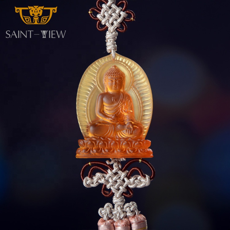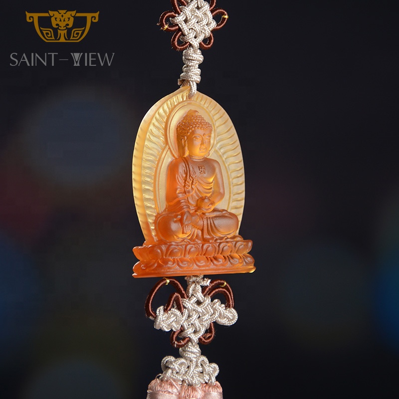 Traditional Double Mini Side Gautam Buddha Amber Glass Car Mirror Hanging Pendant